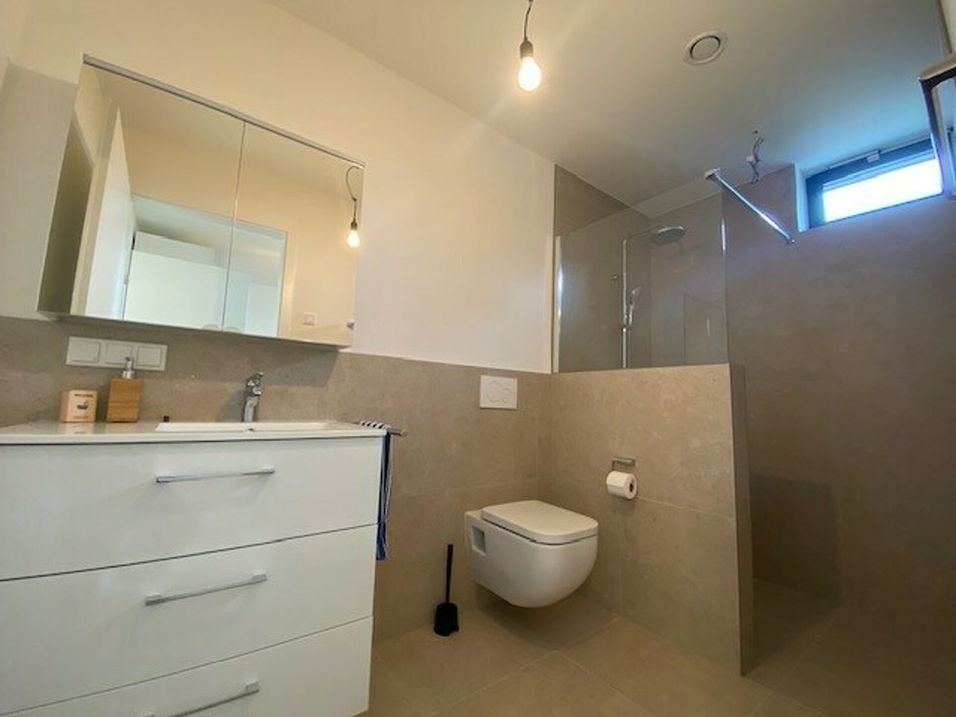 agréable pièce de séjour avec terrasse privative, cuisine équipée ouverte avec lave-linge et rangement, 1 chambre à coucher et 1 salle de douche