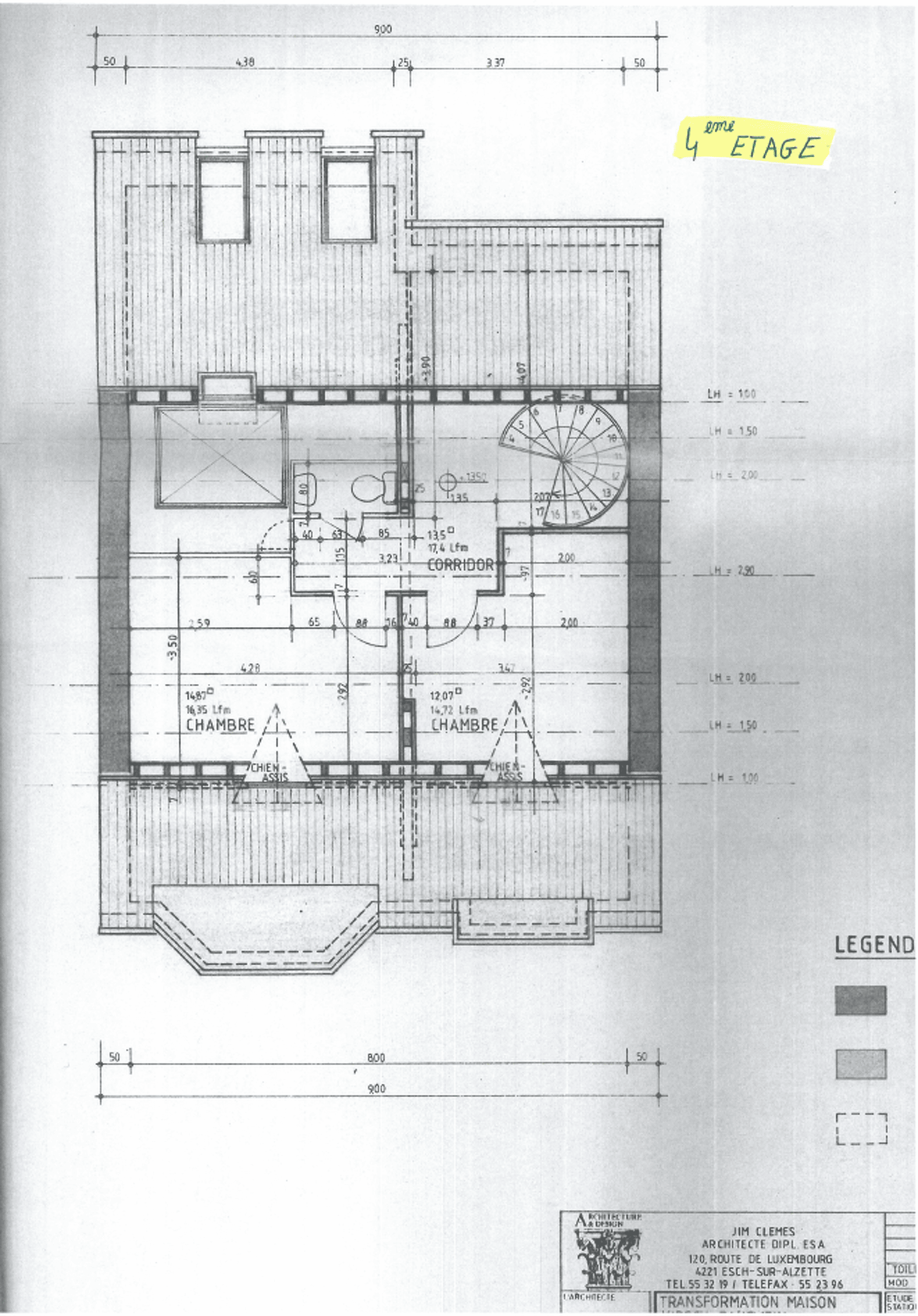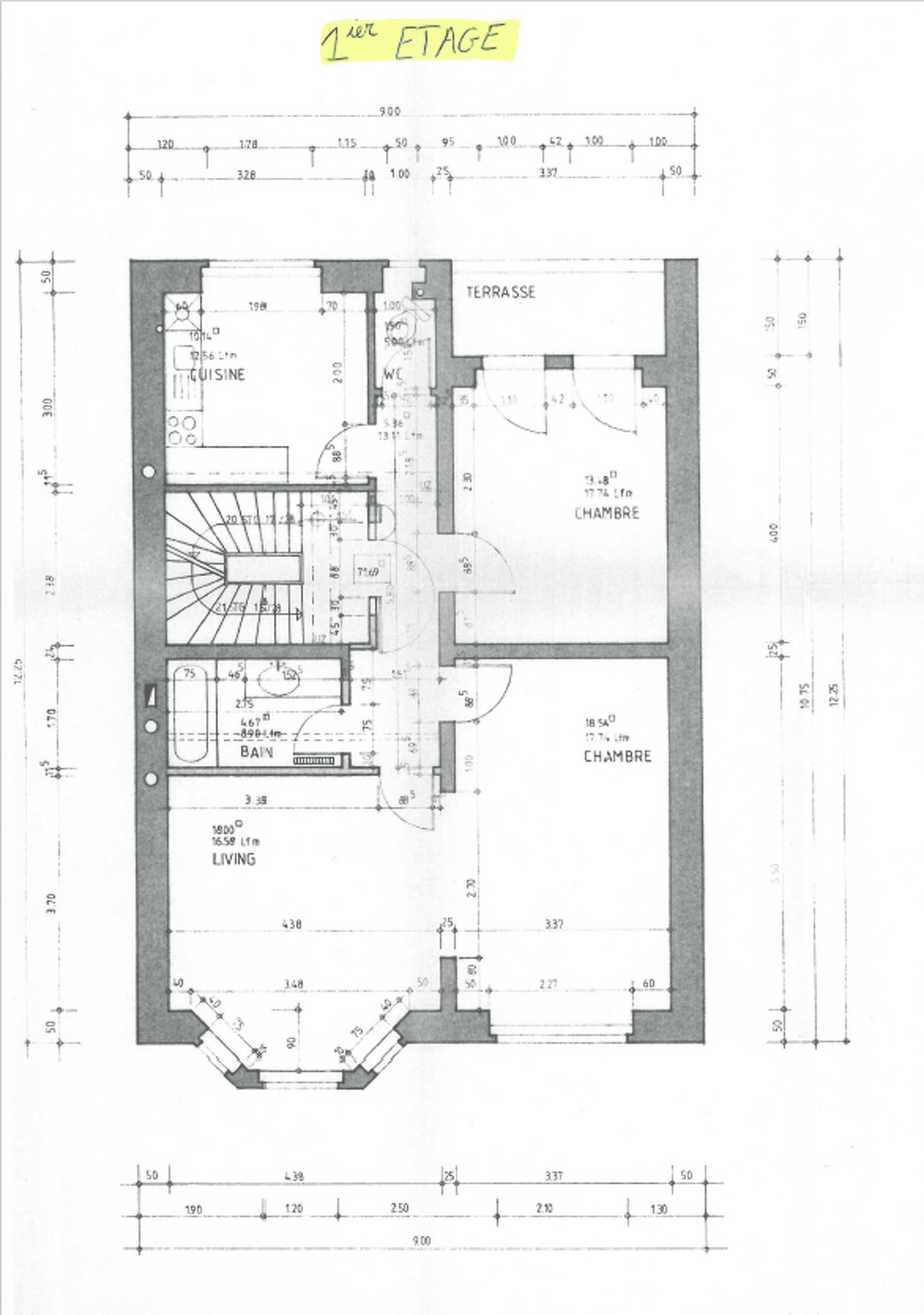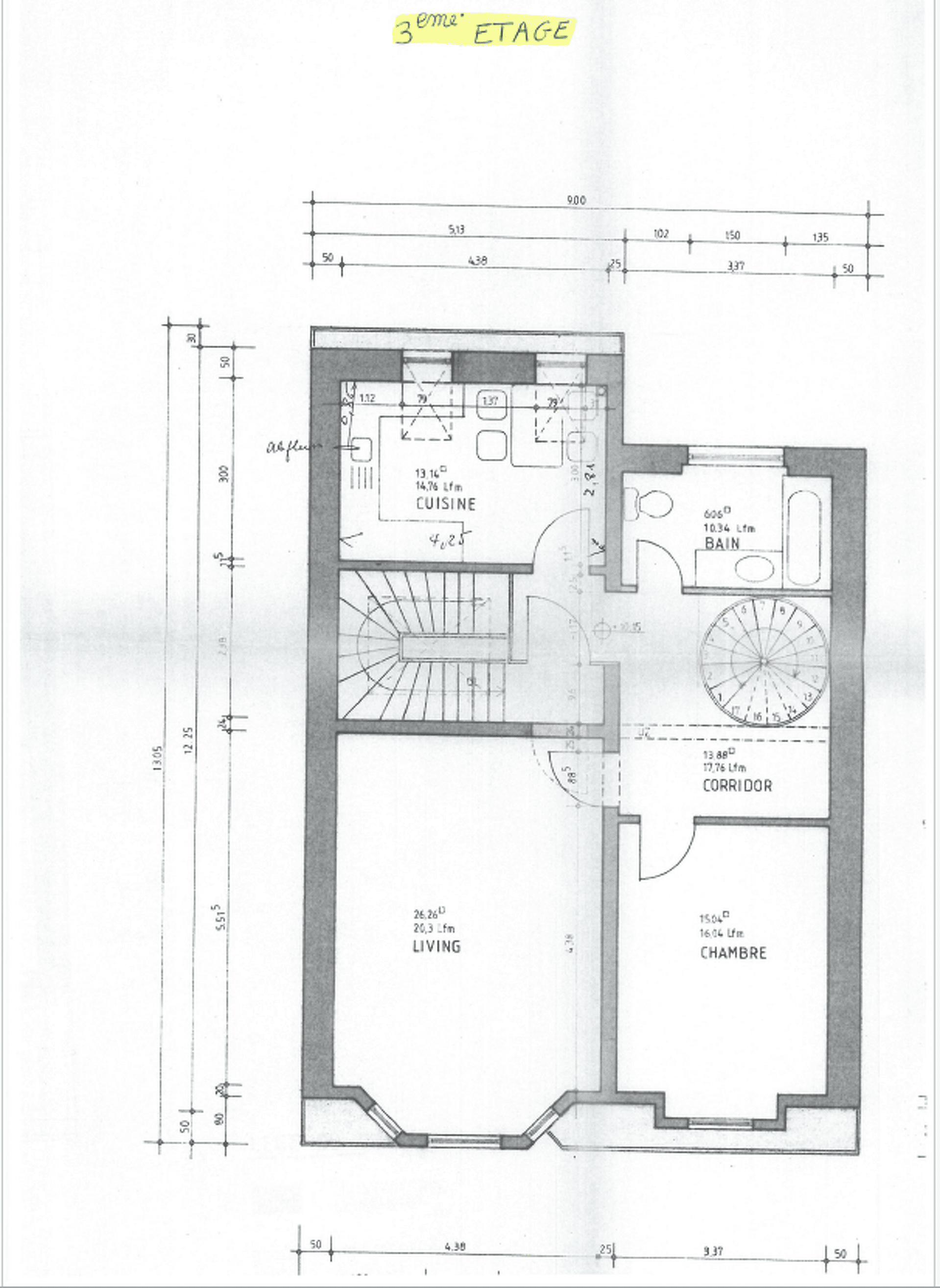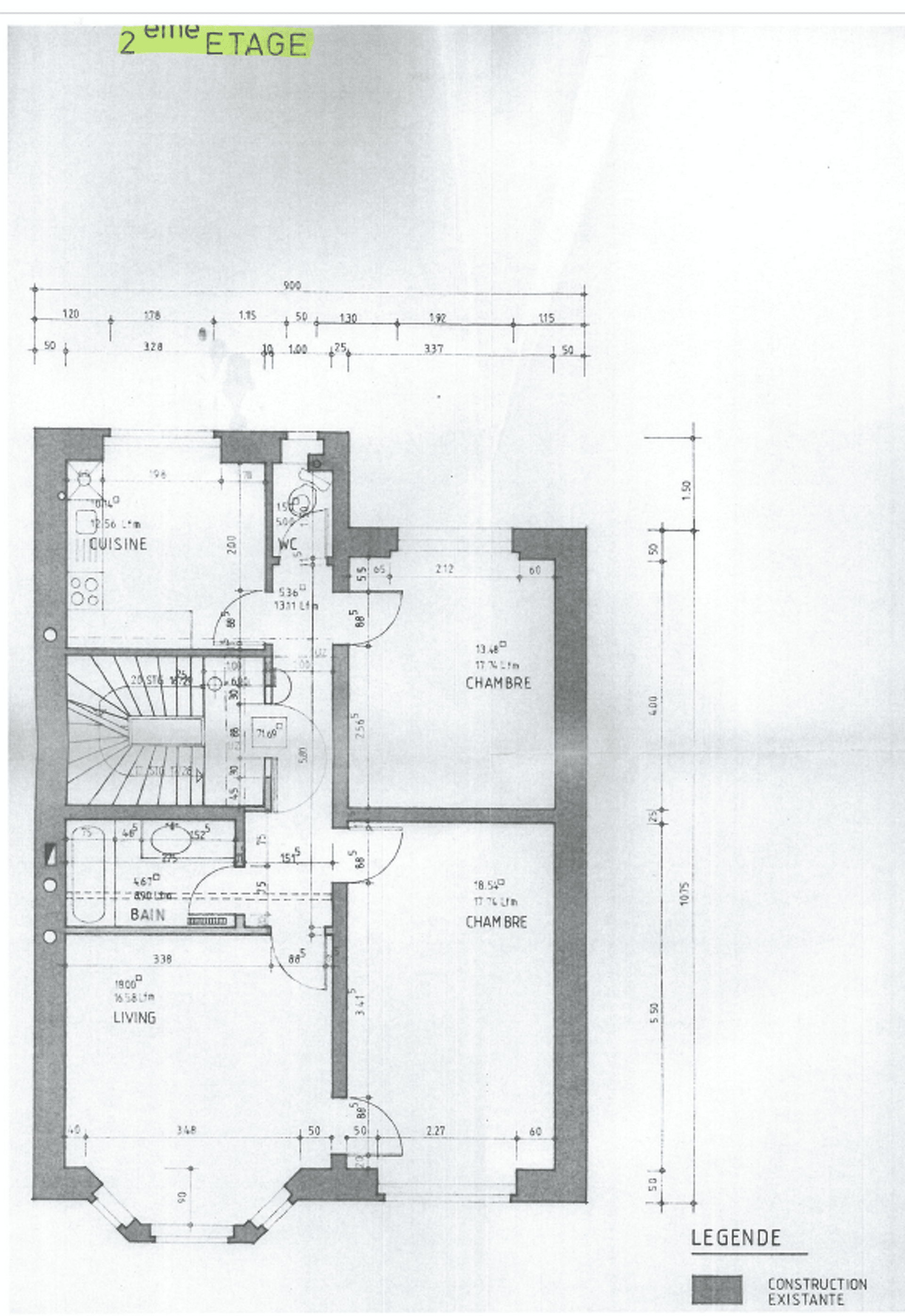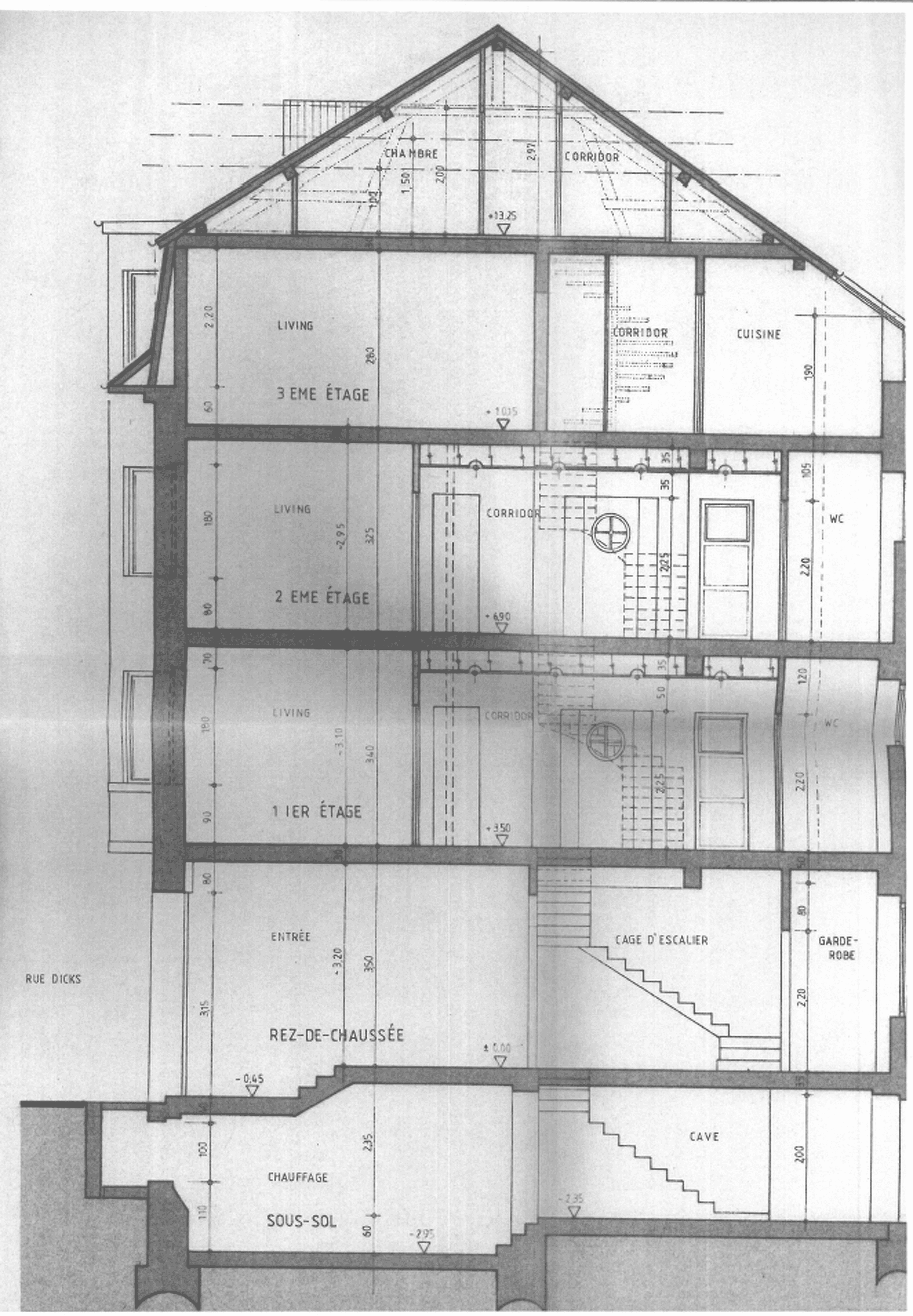 3 ème et 4 ème étage - un appartement duplex (118 m2) comportant un hall d'entrée, un living, une cuisine équipée séparée, une chambre et une salle de bain et à l'étage 2 chambres et un WC séparé.