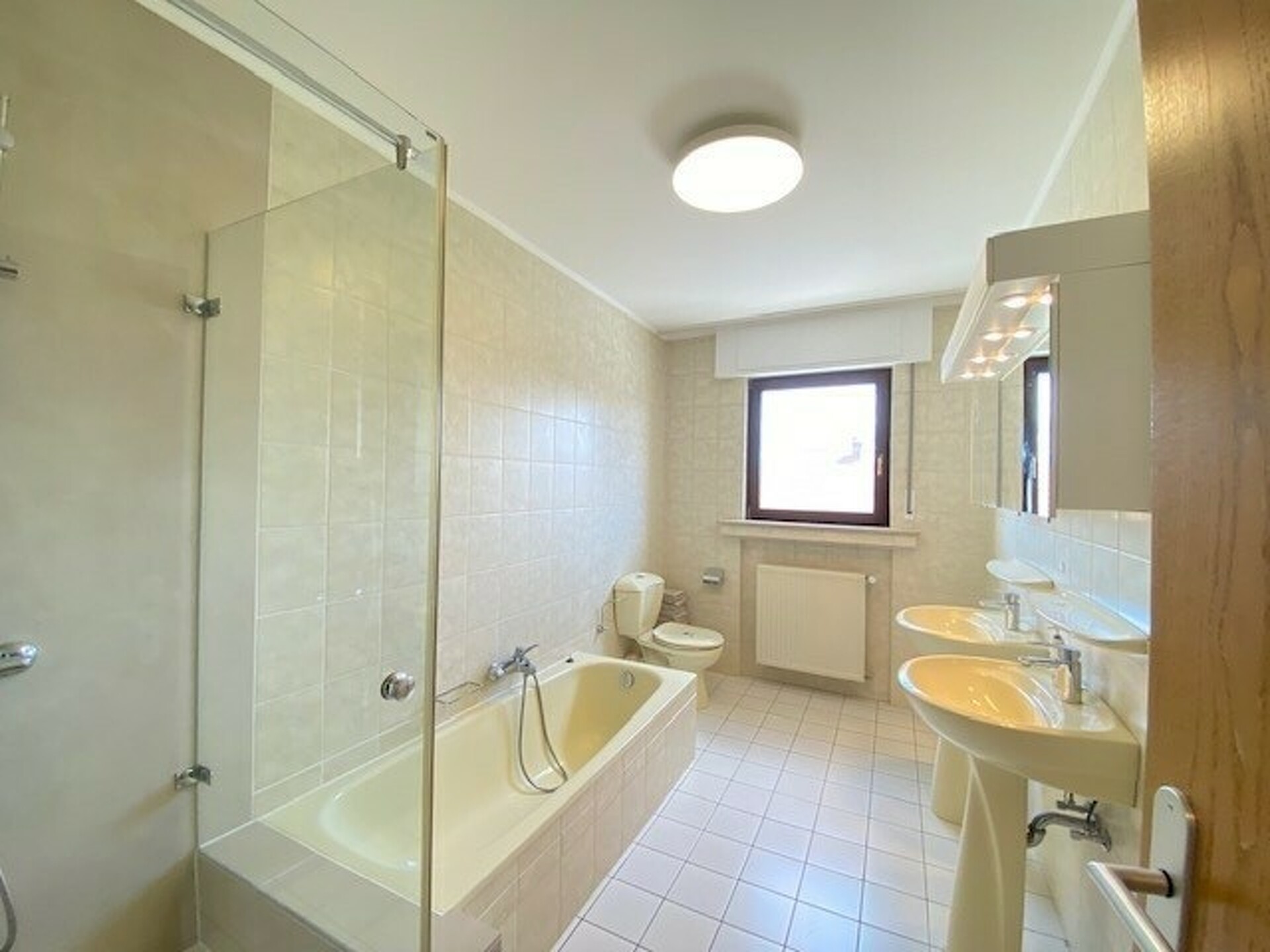 hall d'entrée, living avec balcon, grande cuisine équipée, 2 chambres à coucher, salle de bains avec baignoire, douche et un WC séparé.