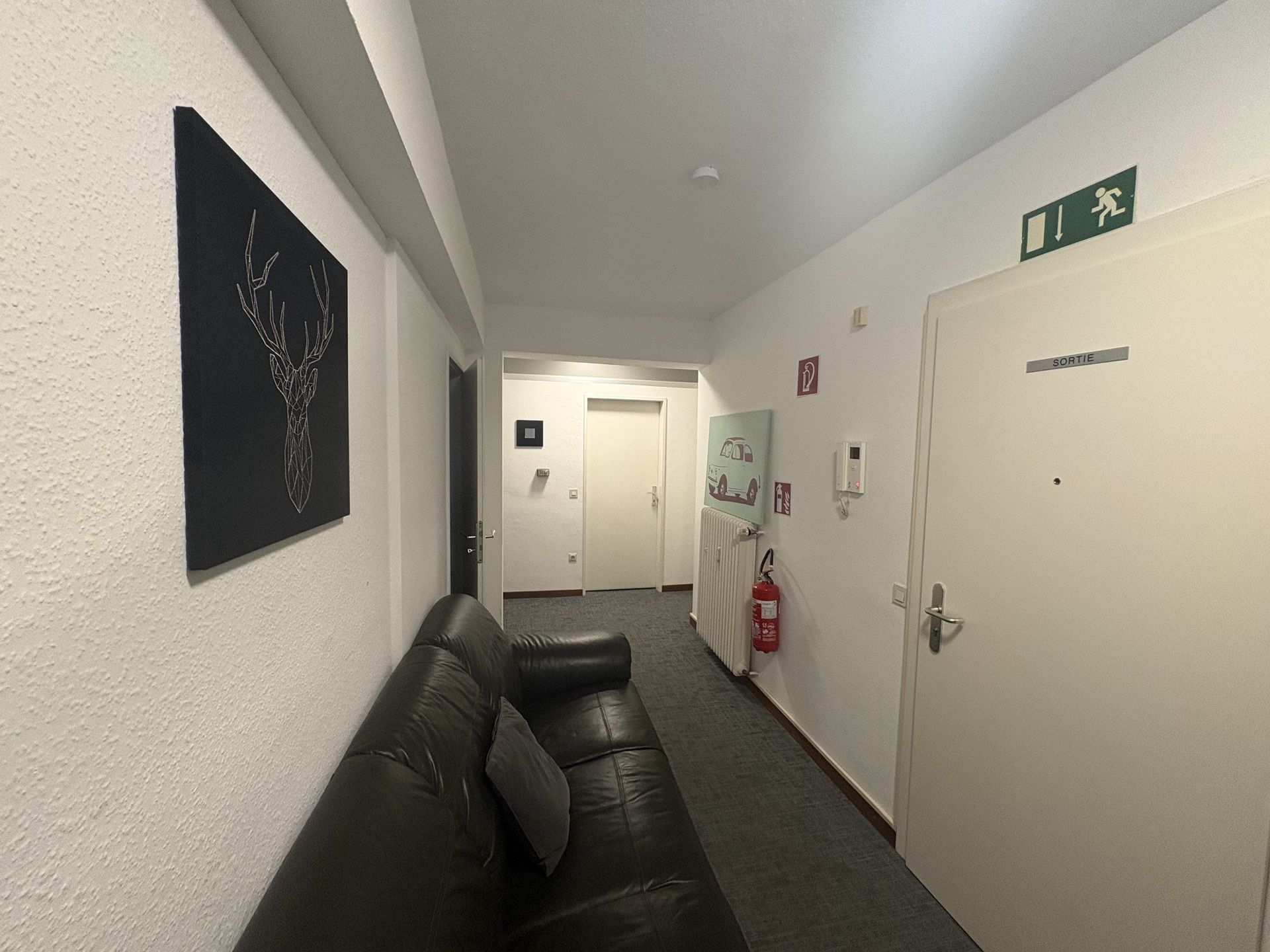 3e étage entier avec ascenseur - 2 entrées séparées, cloisonnement existant en 8 bureaux/ chambres kitchenette, 3 salles de douche, revêtement de sol en moquette, câblage informatique existant et 2 caves au sous-sol