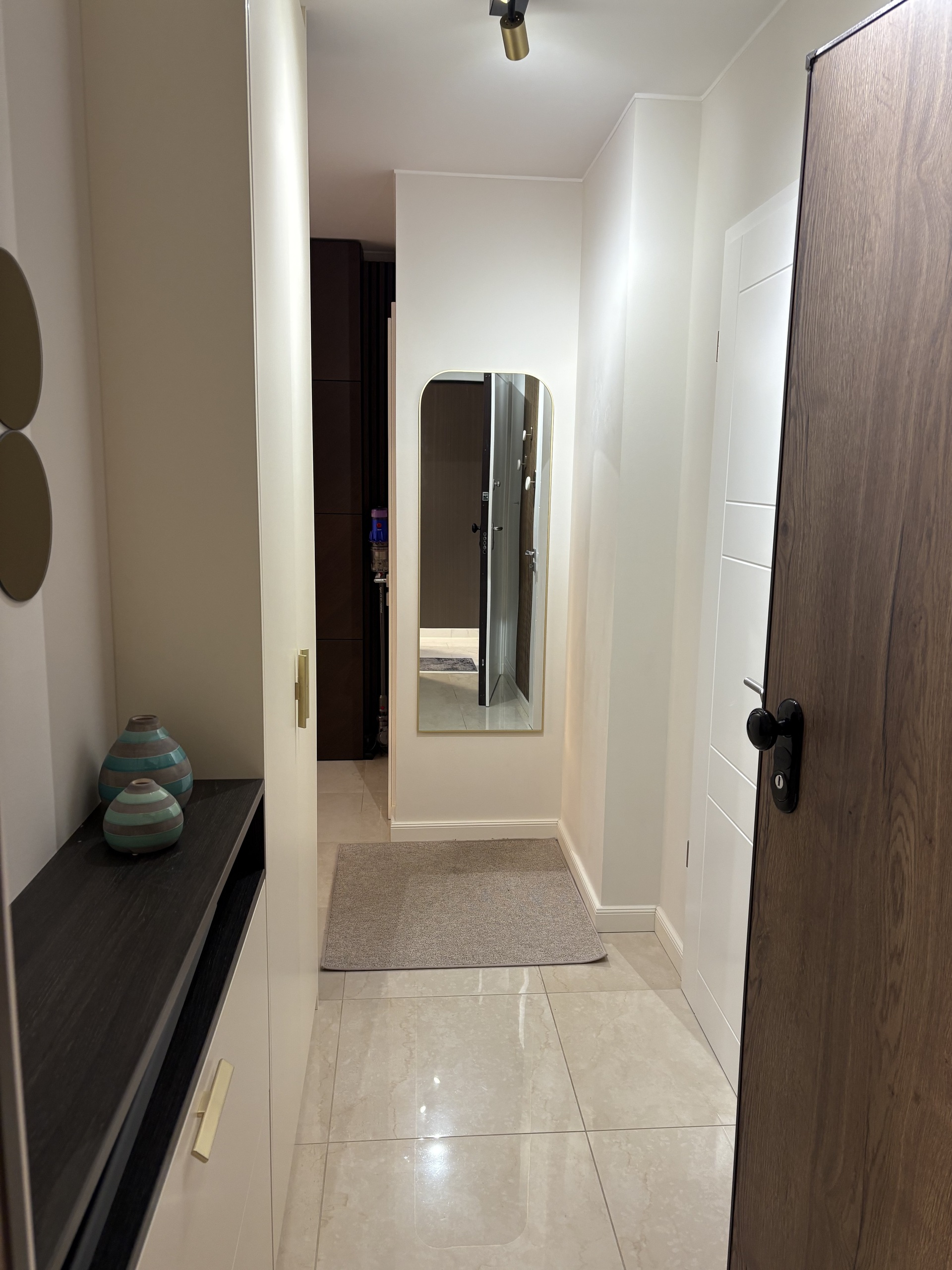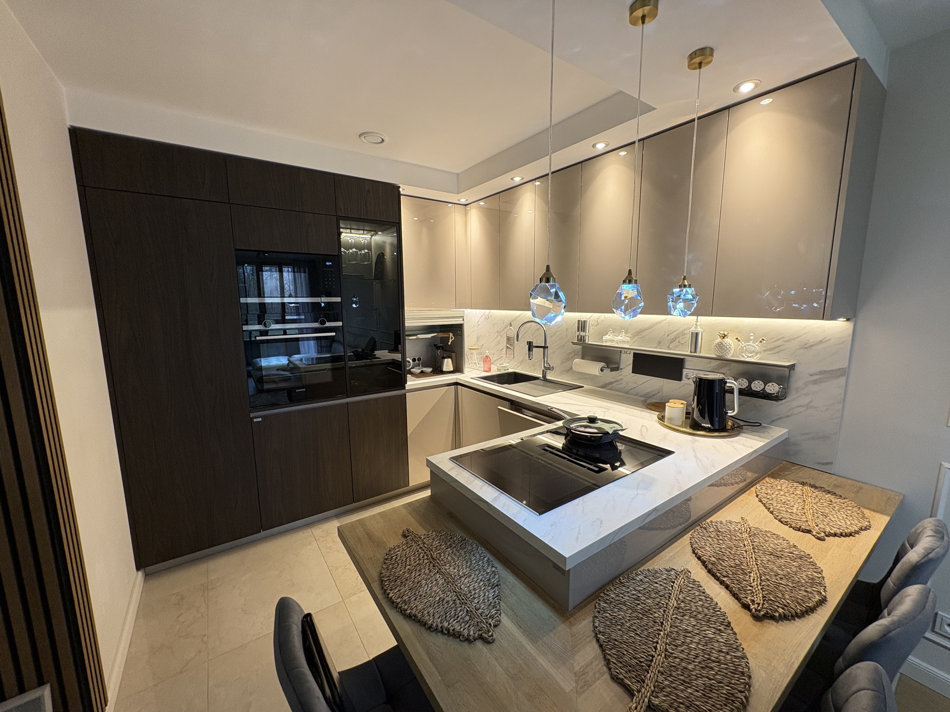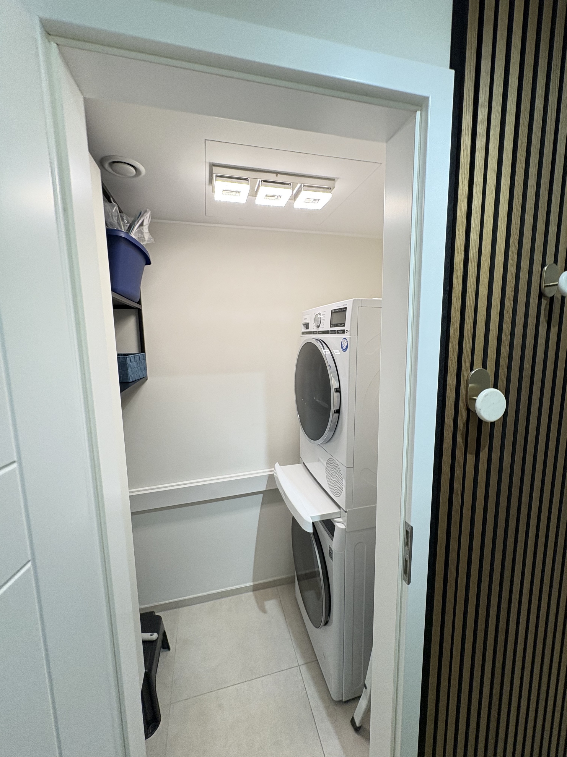 l'entrée avec placards intégrés donne sur une belle cuisine de marque SNAIDERO entièrement équipée ( électroménagers Siemens) et ouverte sur le living avec un canapé lit et un équipement audio - visuel de qualité, Loggia, 1 chambre à coucher avec un grand lit fait sur mesure et box de rangement et une grande armoire intégrée, une salle de bains et un débarras avec une buanderie équipée